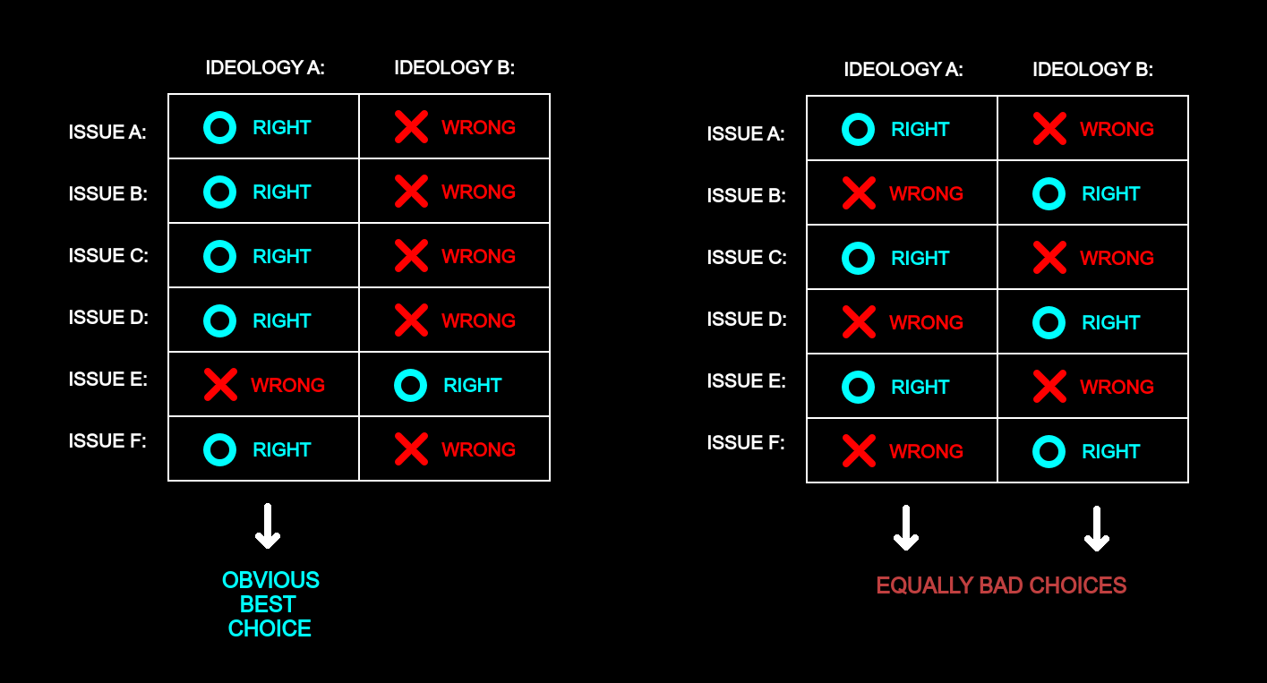 For this reason, the modern ideologies and narratives are systematically manufactured in order never be *entirely* wrong, but to always include a specific amount of truths among the lies: one ideology speaks the truth on issues where the other lies, and vice-versa; in such a way to make the lies seem inherently dependent from the truths (by employing profuse amount of fallacies and other manipulation tactics) in order to present this mix of truths and falsehoods as a coherent, monolithic whole. In this way, any weak-minded person that recognizes the truths will be manipulated into agreeing with the lies too; instead, those who recognize the lies, will also reject the truths, coming to a diametrally opposite opinion that is right where the mainstream one was wrong, but wrong where the mainstream was right.